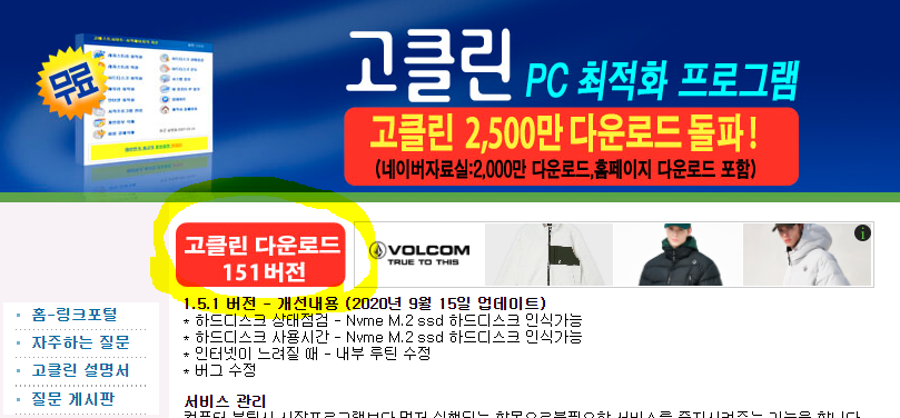 [고클린 다운로드 152버전]이라는 빨간색 버튼을 누르게 되면 즉시 다운로드가 실행됩니다.