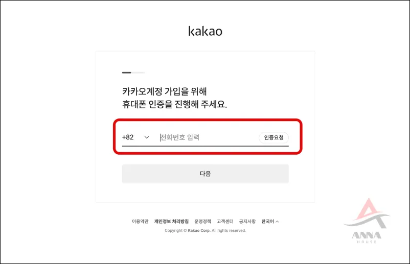 카카오 및 다음 약관에 동의한 후 전화번호를 입력하면 휴대폰 인증이 완료됩니다(중복가입 차단)