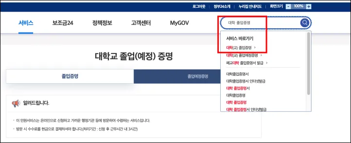 - 검색 결과 중 '대학(교) 졸업(예정)증명서 발급' 선택
