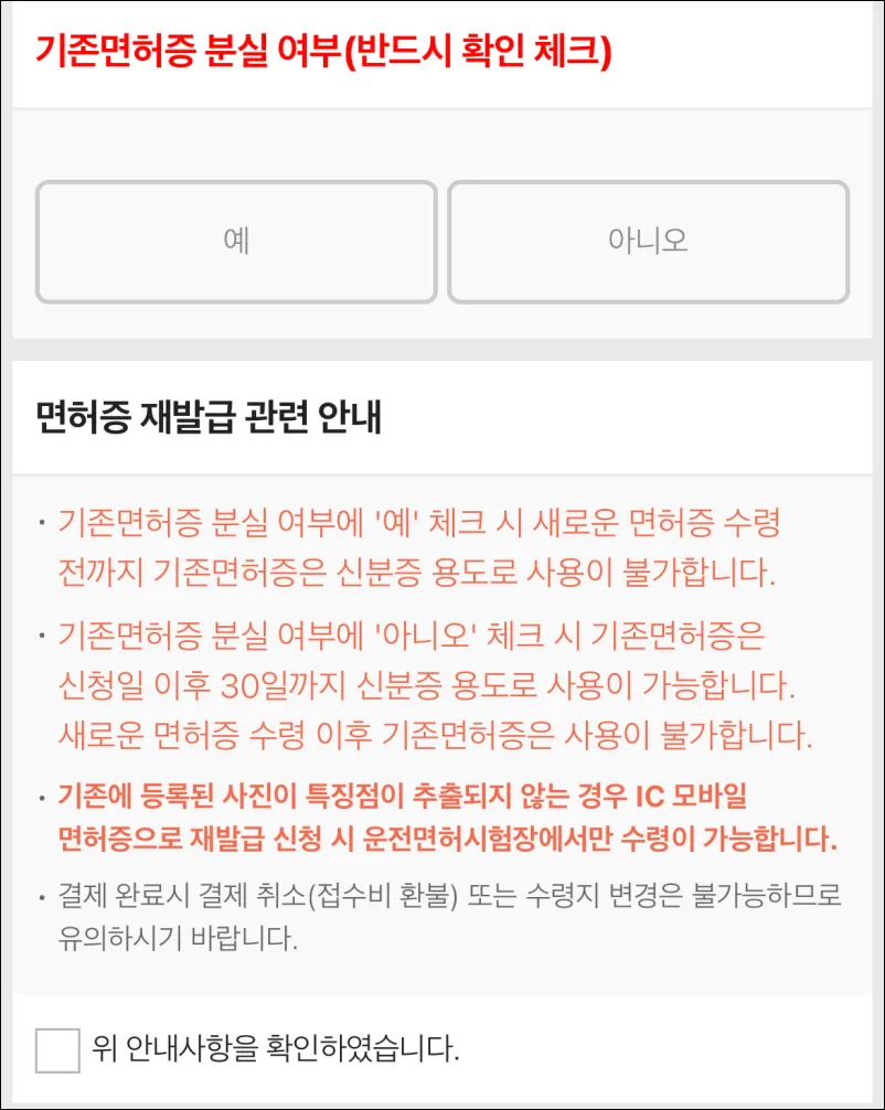 그래서 면허증 재발급 신청 이용약관에 동의하고, 기존면허증 분실여부를 체크합니다.