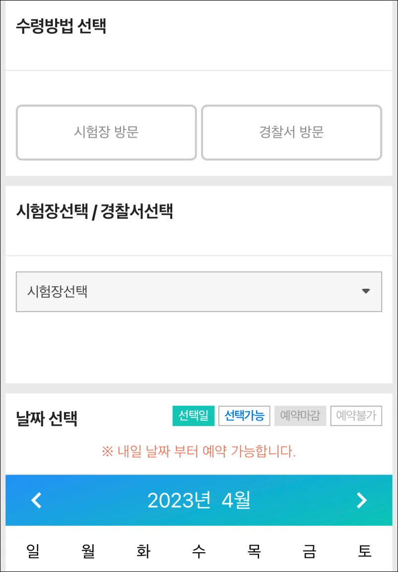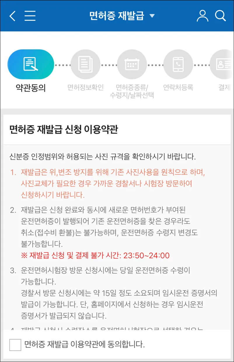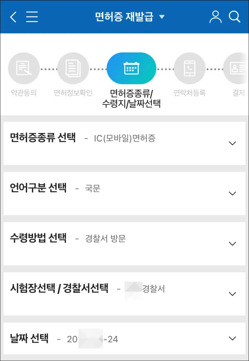 약관 동의가 끝나면 기존 면허 정보를 확인하고, 면허증 종류 및 수령지/날짜를 선택합니다.