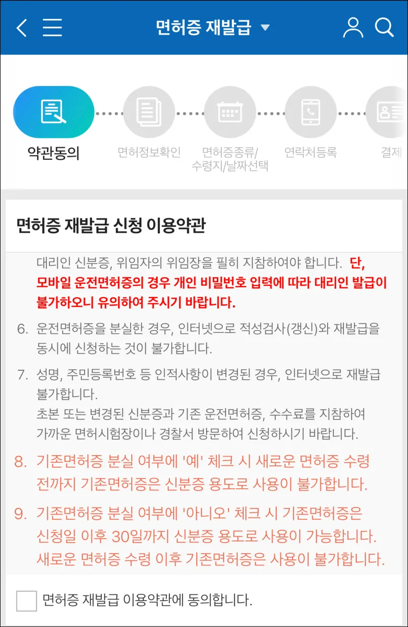 그리고 모바일 면허증을 신청해야하는데, 모바일 면허증은 기존 면허증을 재발급 받아야 가능합니다.