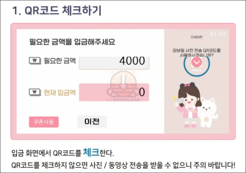 - 입금(결제)화면에서 QR코드 사용에 체크하지 않으면 다운로드가 불가하니 주의해야 합니다.