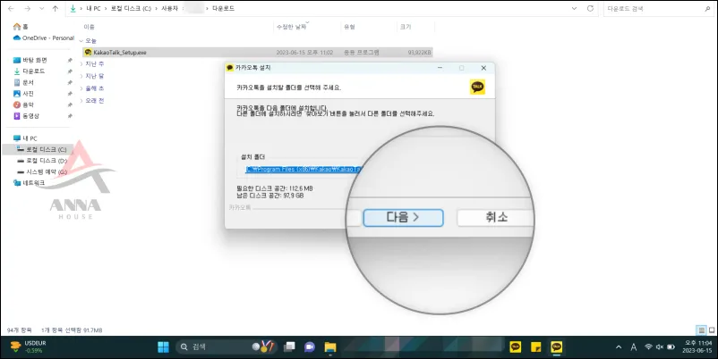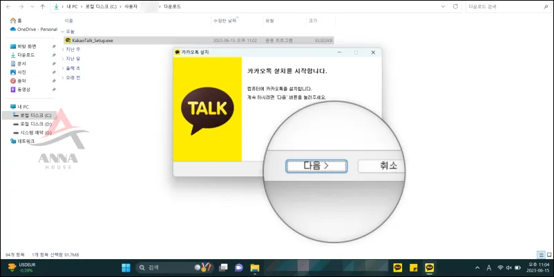 그다음은 카카오톡 설치를 시작합니다.라는 글자가 보이면 [다음] 버튼을 눌러요