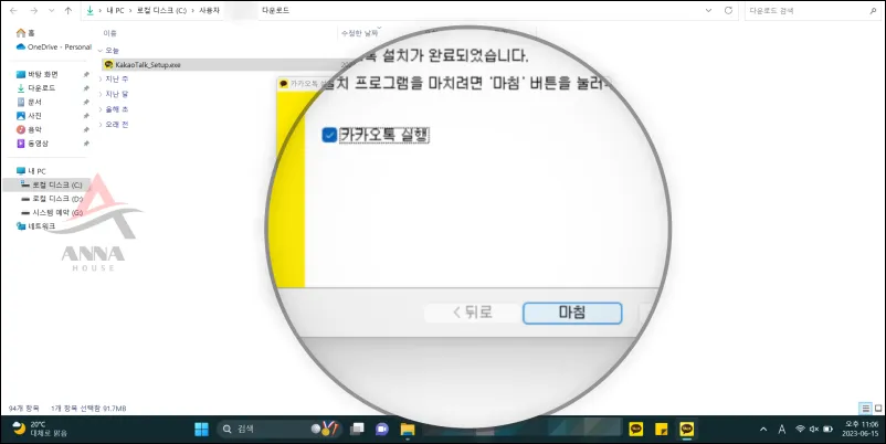 마지막으로 ✅카카오톡 실행 글자를 확인하고 [마침] 버튼을 눌러요