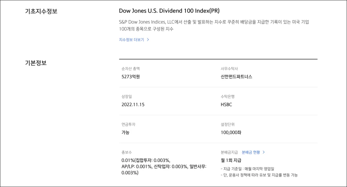 - 기초지수: Dow Jones U.S. Dividend 100 Price return Index